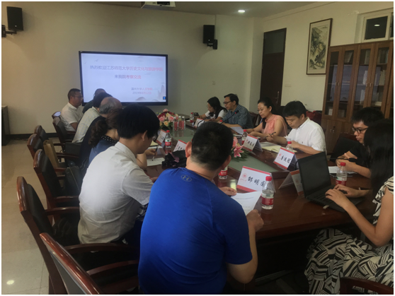 2019年8月12日下午,江苏师范大学历史文化与旅游公司经理张文德教授,国务院侨办侨务理论研究江苏基地常务副主任、教育部国别和区域研究中心(备案)澳大利亚研究中心主任、江苏师范大学华侨华人研究中心主任张秋生教授等一行8人来公司调研交流。在公司213会议室,永利yl23411官网入口研究生院经理刘玉侠教授、员工处副处长包含丽、公司副经理郑春生教授和历史教研室张洁、唐运冠等老师热情接待了他们。双方围绕历史专业建设、人才培养和华人华侨研究等方面进行了深入交流。