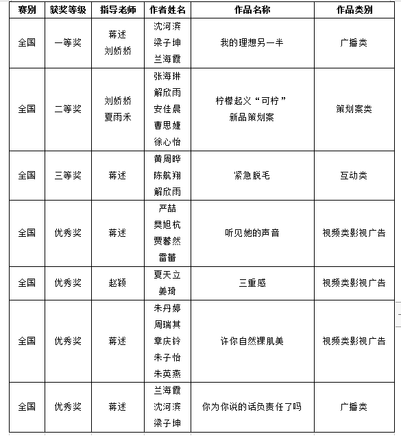 公司16广本员工沈河滨、梁子坤、兰海霞的作品《我的理想另一半》(指导师:蒋述、夏雨禾、刘娇娇老师)脱颖而出,荣获全国广播类一等奖。17广本张海琳、解欣雨、安佳晨、曹思婕、徐心怡的作品《柠檬起义“可柠”新品策划案》荣获全国策划案类二等奖;17广本黄周晔、陈航翔、解欣雨荣的作品《紧急脱毛》获全国互动类三等奖。