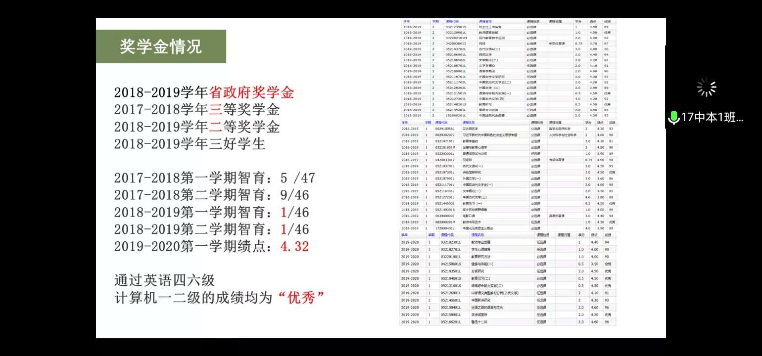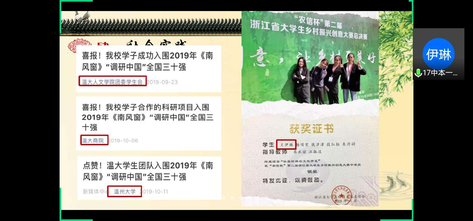 每一份未来都值得期待,每一份荣誉都挥洒着汗水。参评的每位员工以PPT和演讲的方式展示了自己在大学期间的所获所得,表现出了积极向上的精神风貌。经过个人展示和评委线上投票,16历史倪羽筝和17中文1王伊琳将被拟推荐至公司参加评选。