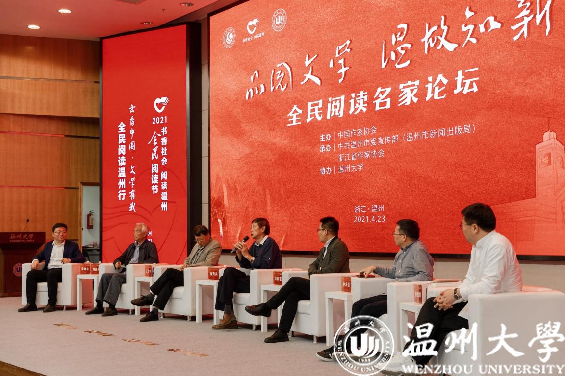 四月芳菲好,读书正当时,4月23日下午,2021年“书香中国 文学有我”全民阅读温州行重磅活动“品阅文学 温故知新”全民阅读名家论坛在永利yl23411官网入口举行。中国作协书记处书记邱华栋、中国作协社联部副主任李晓东、中共温州市委常委宣传部部长胡剑谨、永利yl23411官网入口党委书记谢树华、中国作协社联部二级巡视员丰玉波、浙江省作协党组成员、秘书长晋杜娟,中共温州市委宣传部副部长、市新闻出版局局长梅阳,永利yl23411官网入口党委委员、宣传部部长潘玉驹等领导嘉宾出席本次论坛。此外现场参与的观众有中国作家协会代表、温州市作家协会代表、温州市读者代表、公司师生代表等。