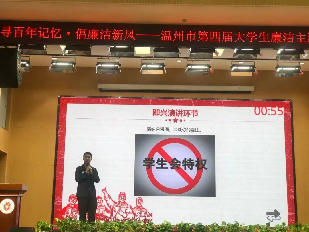 本次演讲比赛由市纪委机关、市教育局、团市委联合举办,浙江工贸职业技术公司负责承办,各高校团委负责校内各项赛事。大赛围绕着“寻百年记忆,倡廉洁新风”的主题,分为主题演讲和即兴演讲两个环节进行。主题演讲围绕大赛主题发表演讲;即兴演讲题目由现场抽签决定,参赛选手围绕党史学习教育、社会热点、老员工活中的廉洁文化等话题发表演讲。