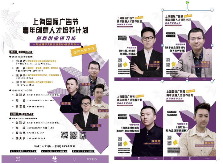 经广告系全体老师共同努力和精心筹备,6月19、20日,一场来自大上海的广告创意头脑风暴,将席卷永利yl23411官网。上海国际广告节把它的拳头公益品牌活动——青年创意人才培养计划创新创业研习坊搬进温大,来自上海国际广告节战略合作方——联合利华旁氏品牌、电通麦利博文、埃森哲互动与光弧科技的业界精英们将为温大广告学子带来精彩纷呈的创新创意创业的饕餮盛宴!