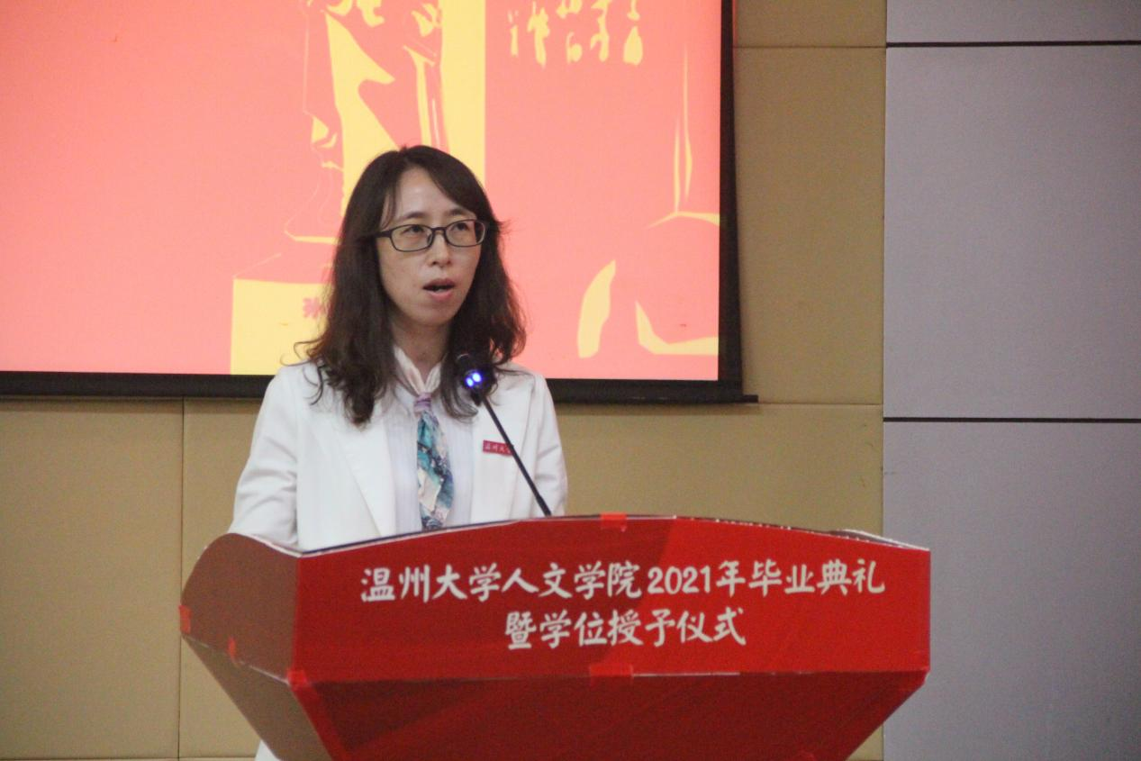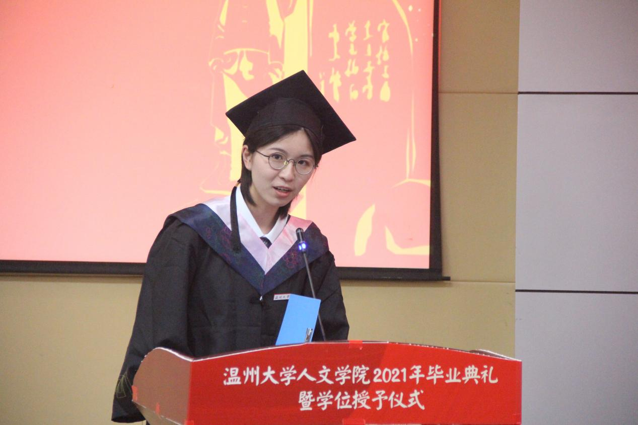 17历史学专业施涵作为毕业生代表,发言中处处流露着对母校的感恩与不舍,同时也表达了对未来的美好憧憬以及对学弟学妹的激励与寄托。随后,全体领导老师为2021届员工联络员颁发聘书。