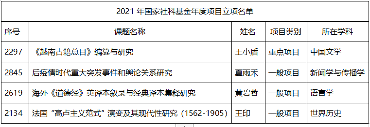 近日,2021年国家社科基金年度项目立项结果公布,公司共获10项国家社科基金项目(重点项目2项、一般项目7项、青年项目1项),其中公司喜获4项国家社科基金项目,其中重点项目1项、一般项目3项,在所有公司中一枝独秀。