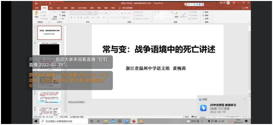 在4月19日下午,省教坛新秀黄惋莉老师通过视频录播的方式带来了《常与变:战争语境中的死亡讲述》的主题讲座以及微讲座《关于情景的思考》。黄惋莉老师分享了自己在中学语文教学中的经验,谈到了语文教学中的情境设定的问题,指出情境设定应当具备实用性、复杂性、真实性等特征,强调了“真实情境”的重要性,情境应当指向对员工语文学科本体认知能力的提升。