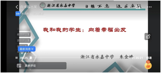 研习进程过半,而同学们热情不减。在4月19日上午,浙江省正高级班主任朱金峰老师通过线上的形式举办了《我和我的员工:向幸福出发》的主题讲座。朱金峰老师谈到了对教师和班主任角色的理解,详细说明了教师职业发展因素之间的内生影响,充分体现了她以员工为主体,以教师为主导的教学理念,为同学们的生涯规划指明了方向,使同学们获益良多。