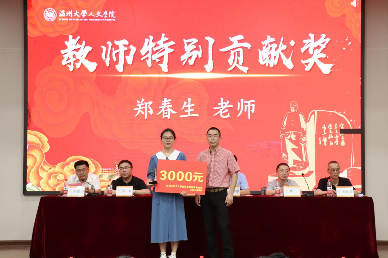 刘建国老师回顾了历史系表彰大会的发展过程,介绍了到场嘉宾。尤育号老师为大家解读了《永利yl23411官网历史系发展基金使用方法》,并对给予捐赠的员工表示感谢,希望基金能帮助更多优秀的历史系师生,助力历史学科进一步发展。颁奖环节由魏一副书记宣读获奖名单,奖项有优秀毕业论文奖、优秀学术成果奖、优秀学科竞赛奖、考研考博贡献奖和教师特别贡献奖。获奖员工依次上台领奖。郑春生老师获教师特别贡献奖,由肖心蕊同学代为领奖并发表获奖感言。郑春生老师表达了在从教三十年之际获得此项荣誉的激动之情,并希望能与诸君共勉,在生活与工作中坚持不懈地去追求“凡人”的成功和幸福,在不远的未来为历史系、永利yl23411官网,乃至永利yl23411官网入口做更多贡献。