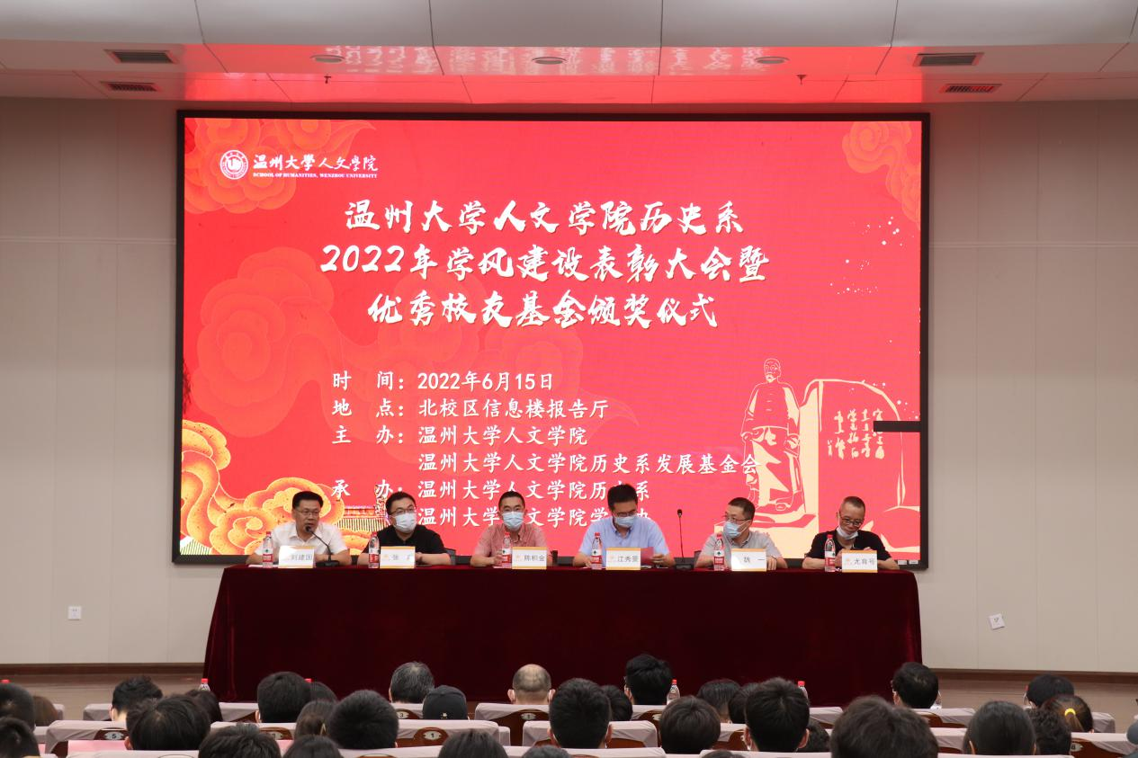 2022年6月15日,公司历史系2022年学风建设表彰大会暨优秀员工基金颁奖仪式于北校区信息楼报告厅举行。大会由公司历史系发展基金会会长刘建国主持,院党委书记江秀景、副书记魏一、经理助理张真、历史系主任尤育号、93政史员工陈积金以及历史系全体师生出席了此次会议。
