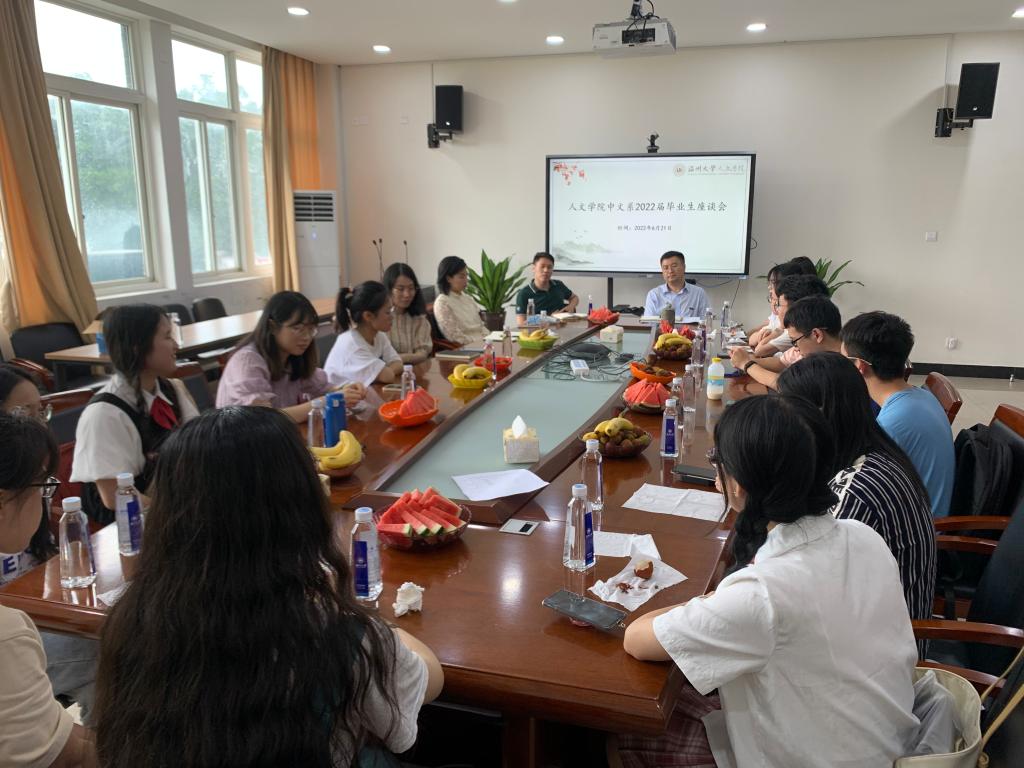 2022年6月21日中午,中文系在人文楼213举行了中文系2022届本科毕业生座谈会。15位毕业生应邀出席座谈会,公司孙良好经理、中文系主任鲍良兵、副主任余琼和李广旭参加了座谈。