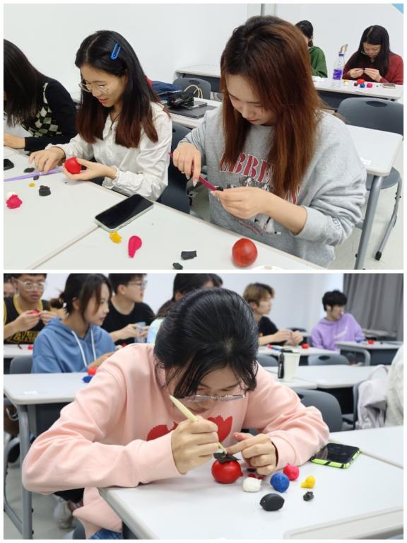 揉、捏、掐、剪、刻、挑……同学们跟着老师的讲解,一步一步,一点一点,细致耐心地捏塑,一件完整的“柿子”作品终于制作成形。