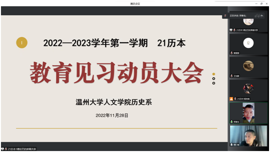 2022年11月28日公司21级历史系教育见习动员大会在线上召开。会议由杨持美同学主持,来自21级历史系的同学们和永利yl23411官网副经理郑春生老师、历史系主任尤育号老师、阙仁镇老师、王鹏老师、王印老师参与了本次动员会。