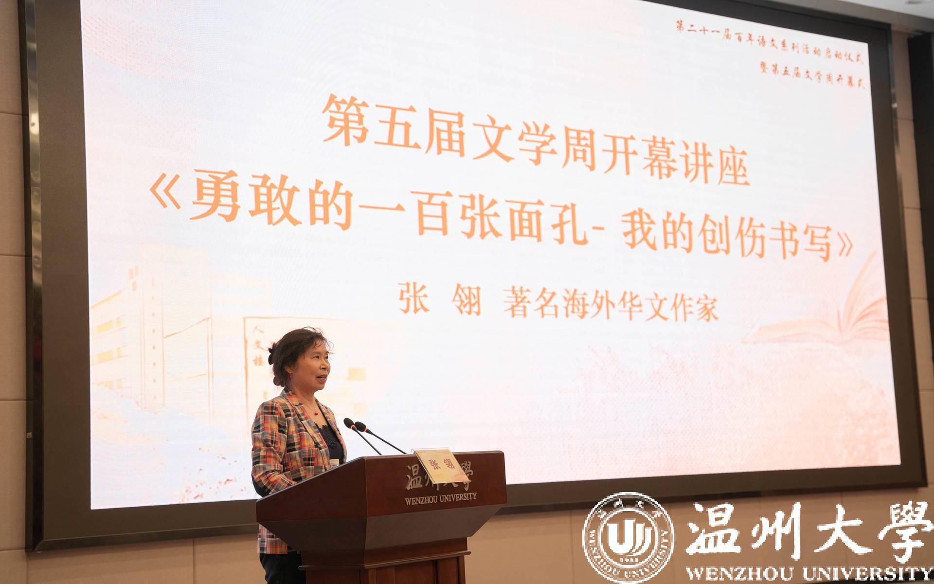 最后,由著名海外华文作家张翎作第五届文学周开幕讲座《勇敢的一百张面孔——我的创伤写作》。她从自己在海外从事听力康复师时接触的病人故事讲起,结合自身工作经历提出要用包容的心态去理解“勇敢”的不同内涵,要用心去关注每一种表达方式,特别强调“记住的东西才有生命”,字字发聋振聩,掌声不息。