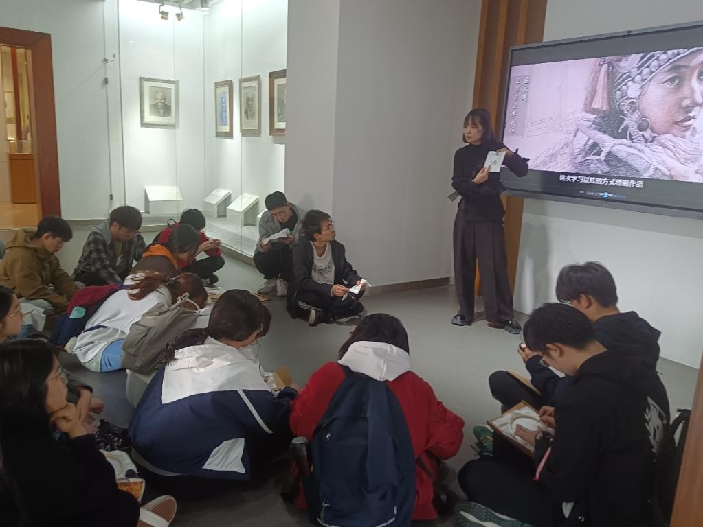 孟永国老师在发绣馆为同学们介绍发绣作品