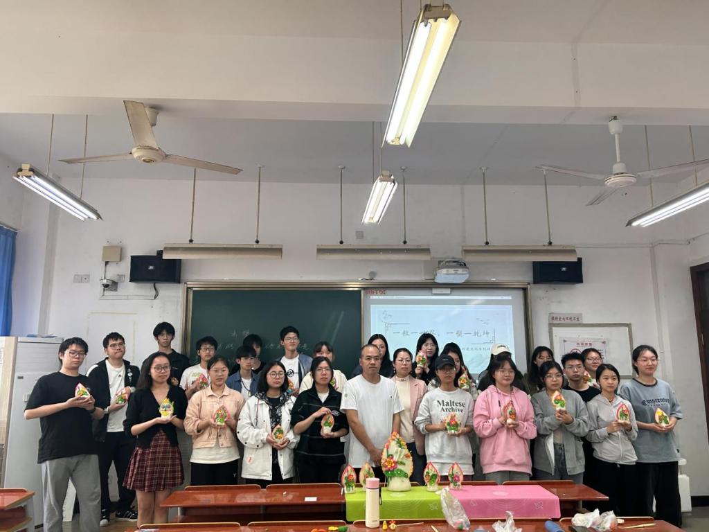 同学们带着自己的米塑作品与陈晓爱老师合影
