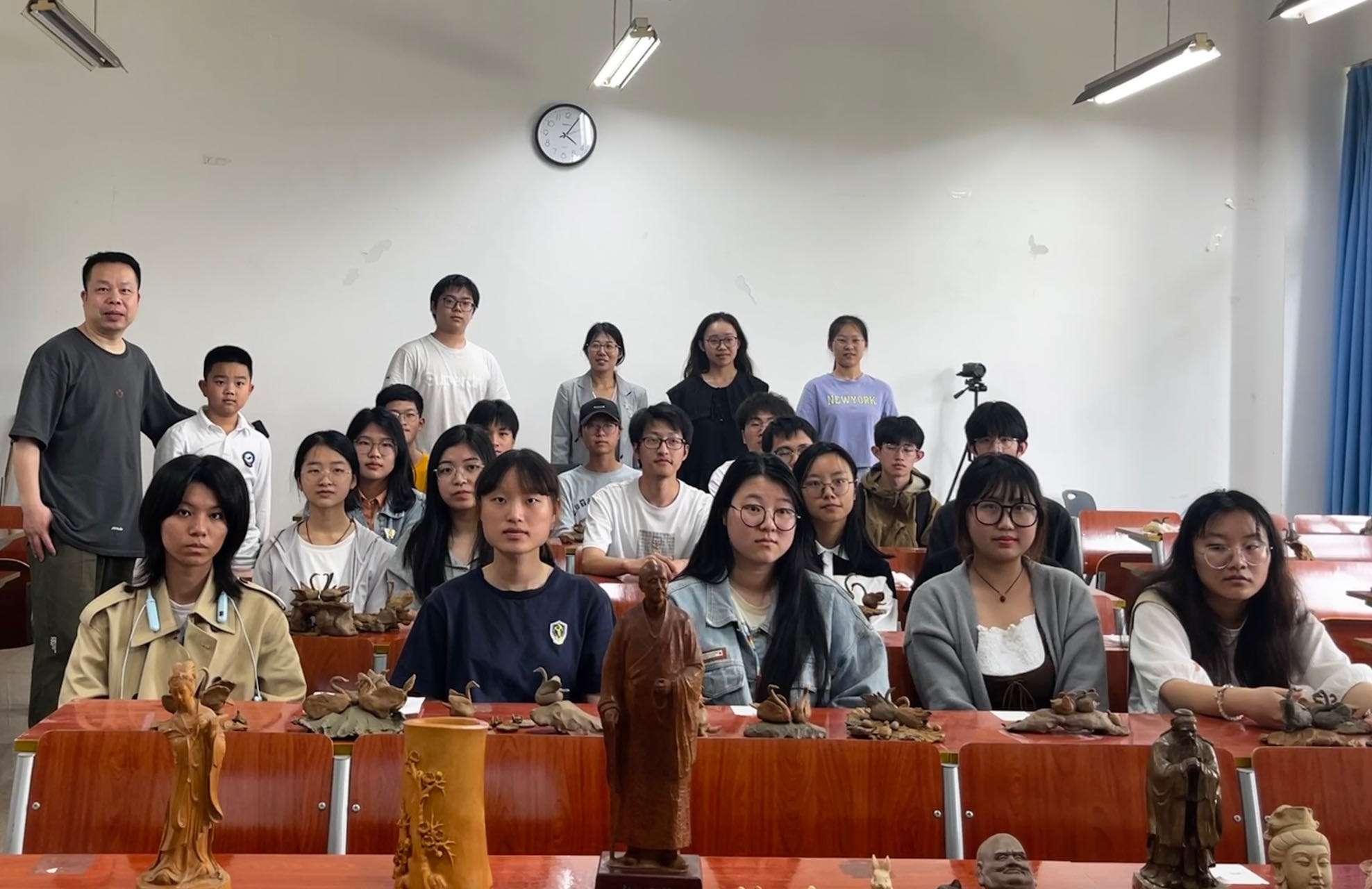同学们带着自己的泥塑作品与叶老师合影