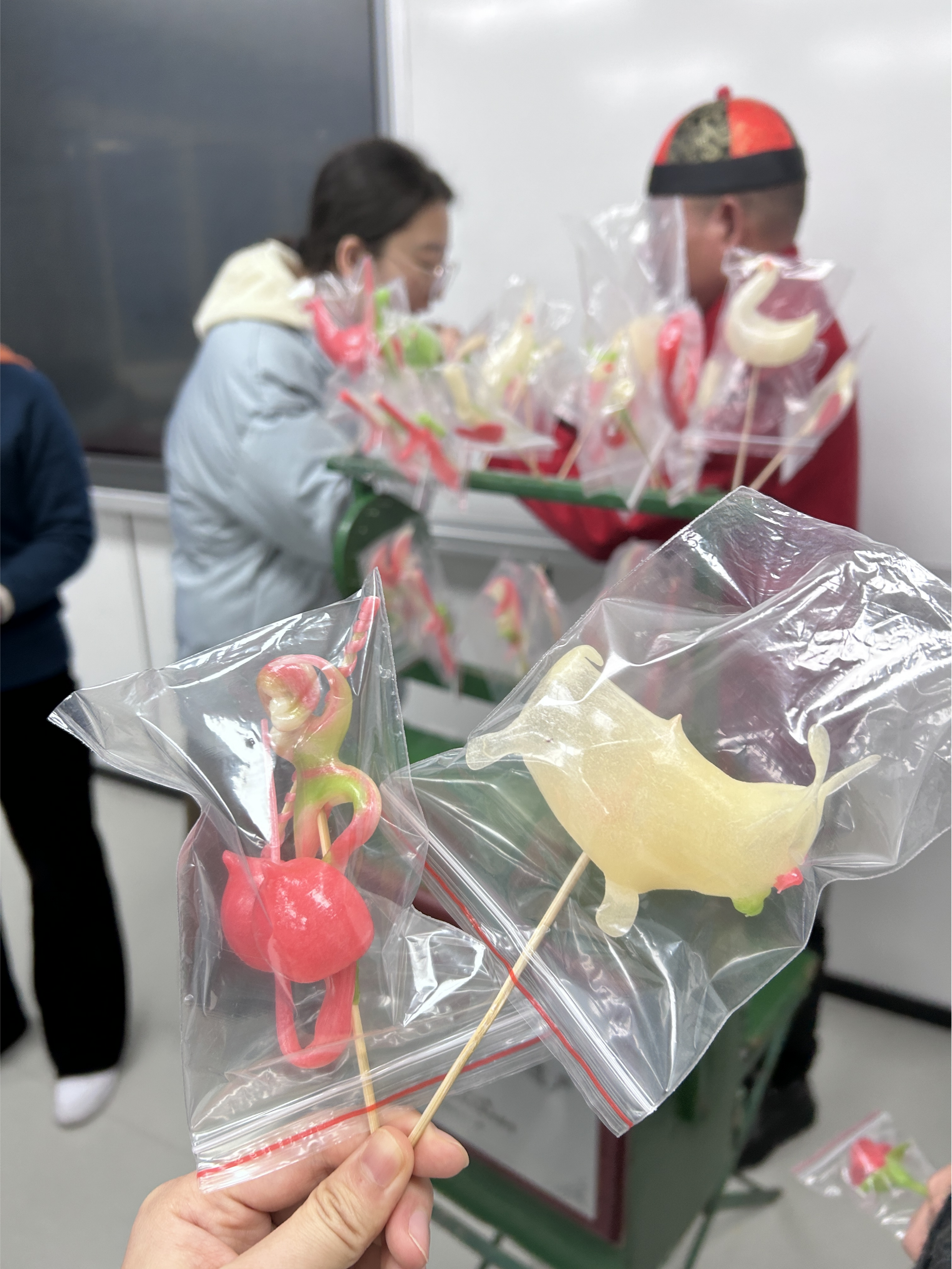 曹老师在上课前先给同学们介绍吹糖人相关的故事以及他与“糖人”之间的不解之缘,之后便亲自示范他是如何吹出一个栩栩如生的糖人。只见曹老师对着糖块的口一边吹气一边动手捏,不一会儿一个栩栩如生的兔子就做成功了,看到曹老师如魔法般地变出一个“糖兔子”,同学们纷纷鼓掌赞扬,并跃跃欲试地想自己亲手体会吹糖人的快乐。在曹老师的指点下,同学们渐渐掌握了吹气的技巧,和曹老师一个吹一个捏,配合得相当默契,技术熟练的同学还能自己边吹边捏,形状也是根据自己的兴趣随意发挥,有老虎、葫芦、鱼、老鼠等等。“这种能自己动手边做边吃的课堂真是太快乐了,学的还是非遗知识呢!”临近课堂尾声时,张同学发出这样的感慨。
