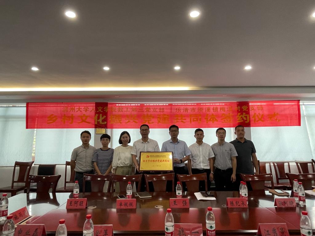 为进一步探索乡村振兴新路径,深化“双百双千”专项行动,7月19日下午,在乐清市淡溪镇梅溪村村委大楼举行永利yl23411官网教工第三党支部-乐清市淡溪镇梅溪村党支部助力乡村振兴党建共同体签约仪式。淡溪镇党委书记陈纪承、淡溪镇党委委员张阿晓、梅溪村支部书记王强及梅溪村领导班子等人出席签约仪式;永利yl23411官网入口公司党委书记江秀景,永利yl23411官网入口公司党委副书记魏一,永利yl23411官网地名研究中心主任盛爱萍,永利yl23411官网中文系副主任余琼等高校代表出席签约仪式。魏一副书记主持签约和授牌仪式。