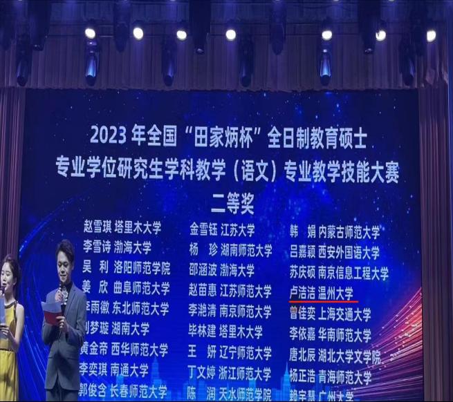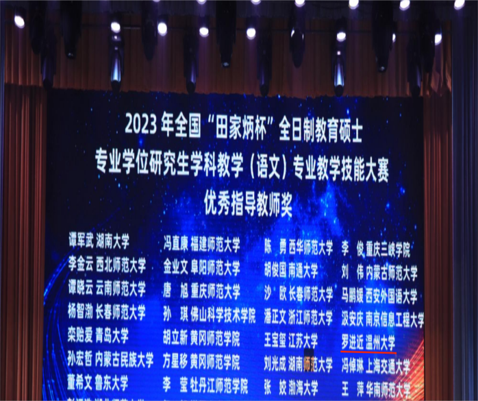 2023年10月14-15日,“田家炳杯”全日制教育硕士专业学位研究生学科教学(语文)教学技能大赛决赛在长春师范大学成功举办。公司2021级学科教学(语文)专业硕士研究生卢洁洁凭借扎实的专业基础和出色的教学技能荣获二等奖,同时罗进近老师荣获优秀指导教师。