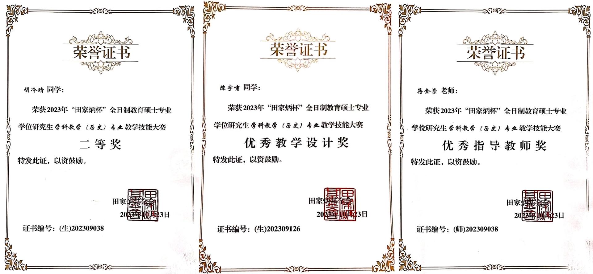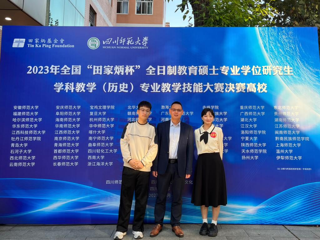 2023年10月21-23日,全国 “田家炳杯”全日制教育硕士专业学位研究生学科教学(历史)教学技能大赛决赛在四川师范大学举行。由陈勇副教授带队参赛的公司学子取得了优异成绩,21级学科教学(历史)胡冷晴荣获二等奖、陈宇啸获优秀教学设计奖,蒋金崇教授获优秀指导教师奖。