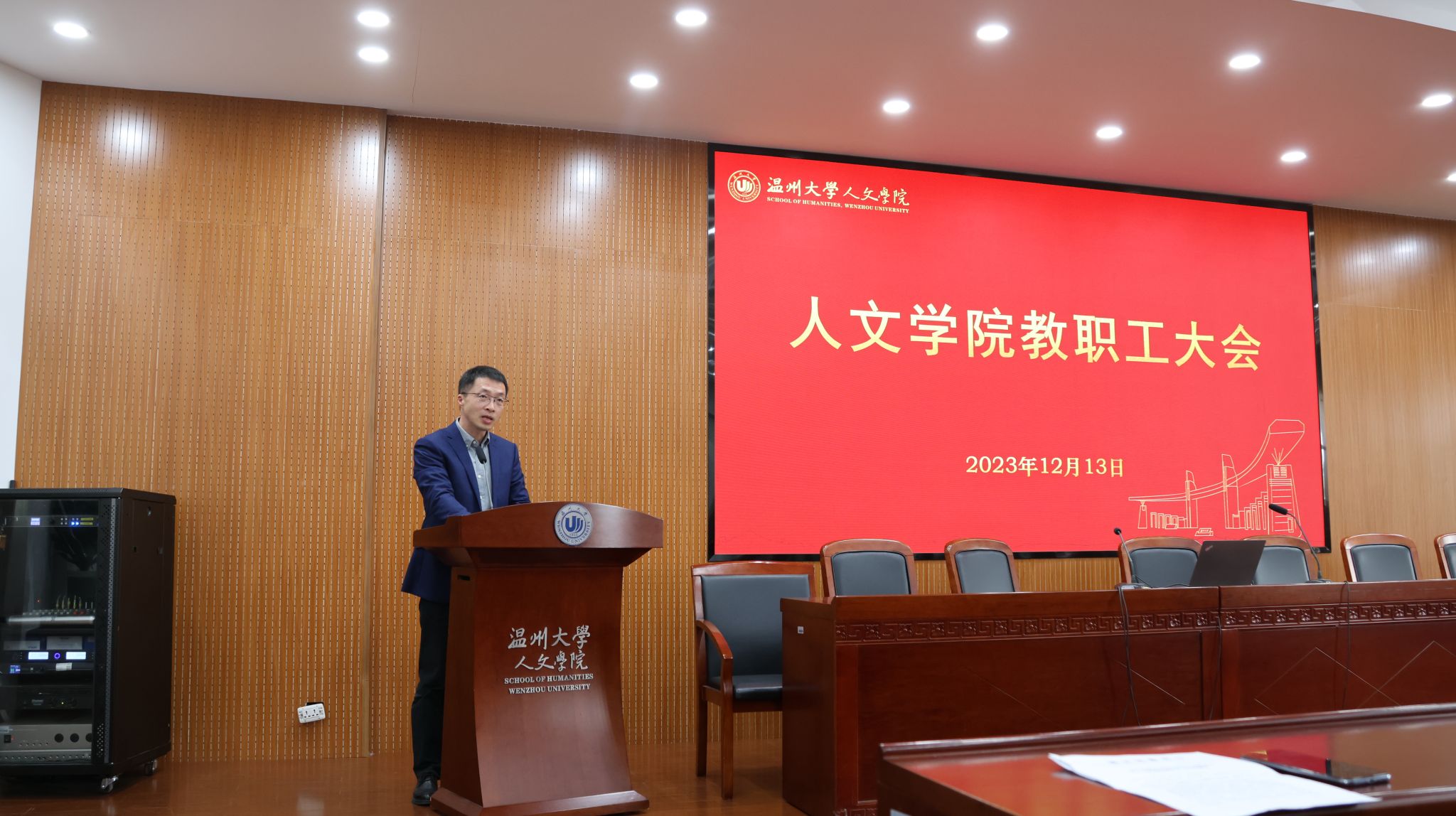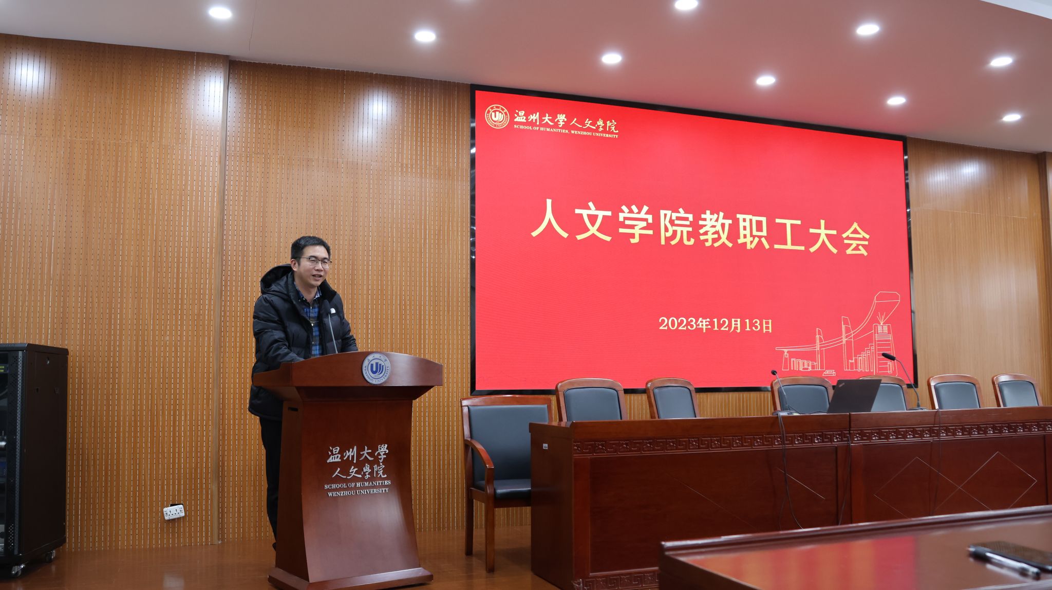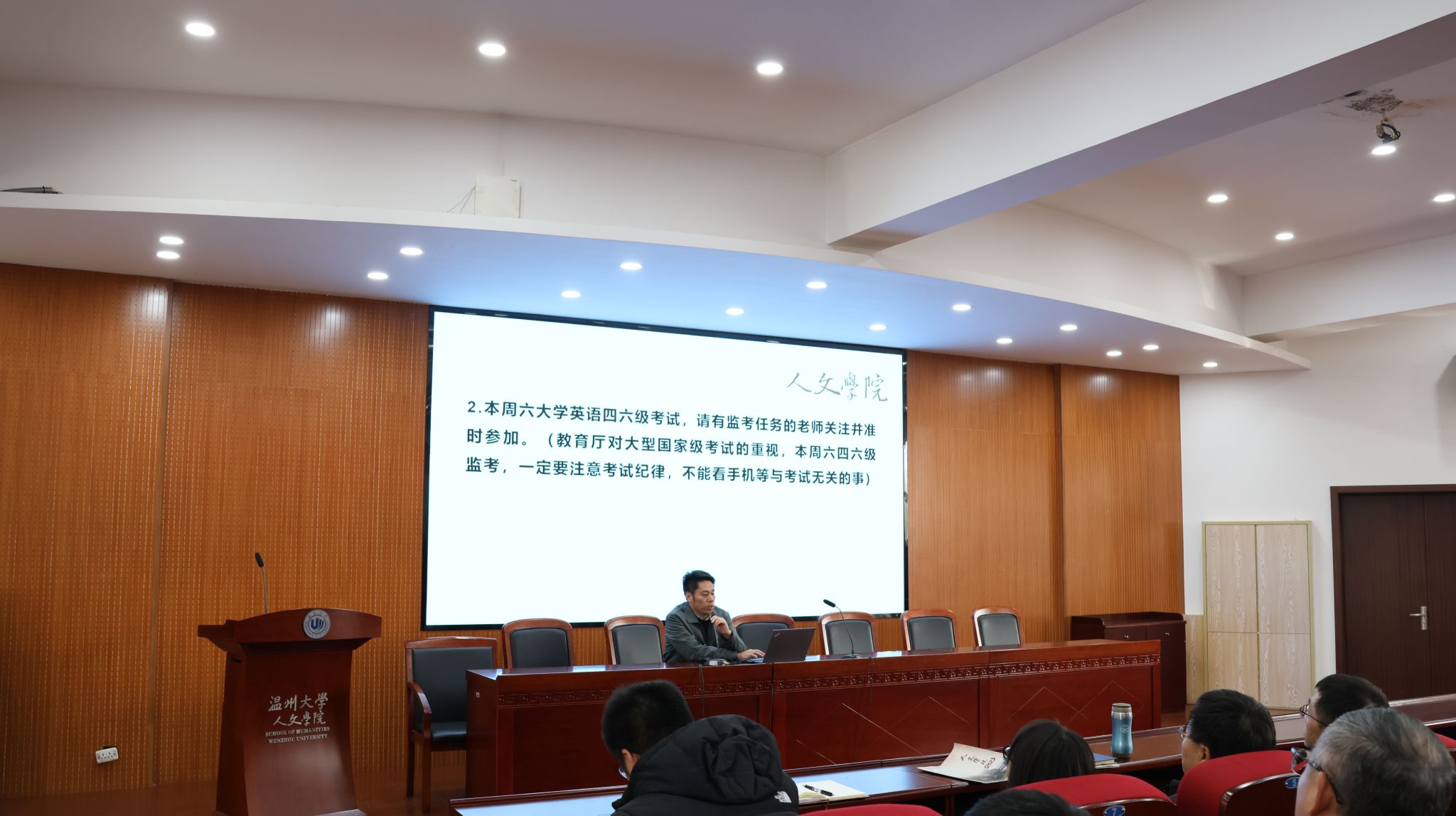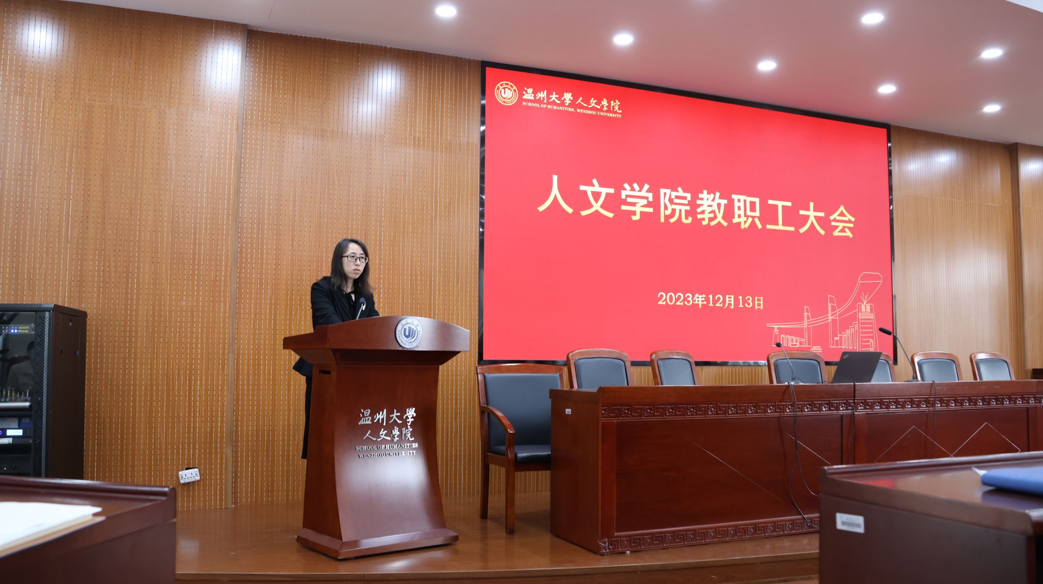 陈源源副经理向全院各位老师通报本学期学科、科研、研究生方面的相关工作以及近期的相关安排,并对中文学科申博工作进行了展望。
