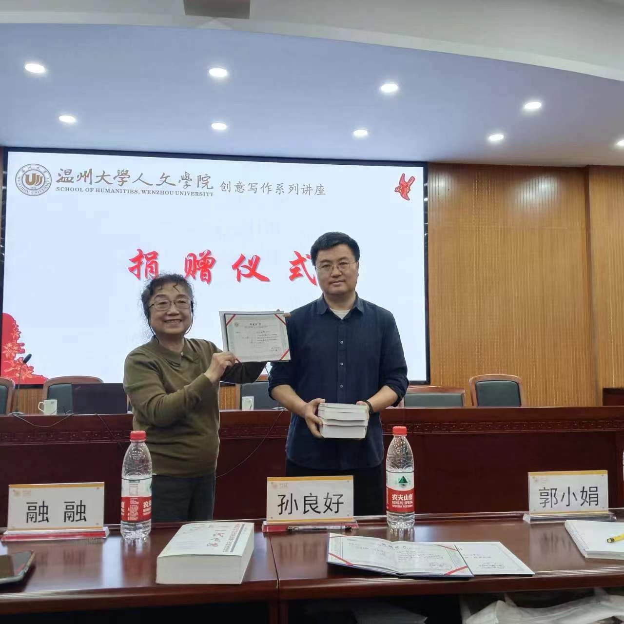 孙良好经理向三位作家表达了感谢,并赠予了永利yl23411官网入口捐赠赠书。他在致辞中表示,永利yl23411官网入口在海外华文研究方面具有天然的优势,两位著名海外华文作家张翎与陈河分别是温大的驻校作家与杰出员工,他们的存在为温大打造侨特色奠定了坚实的基础。今天这么多优秀的海外华文作家汇聚瓯越大地,不仅为温大师生开阔了视野,也助力了永利yl23411官网入口在人文领域建设侨特色,温大会将自己的视野持续放在海外华文界,为之贡献自己的力量。