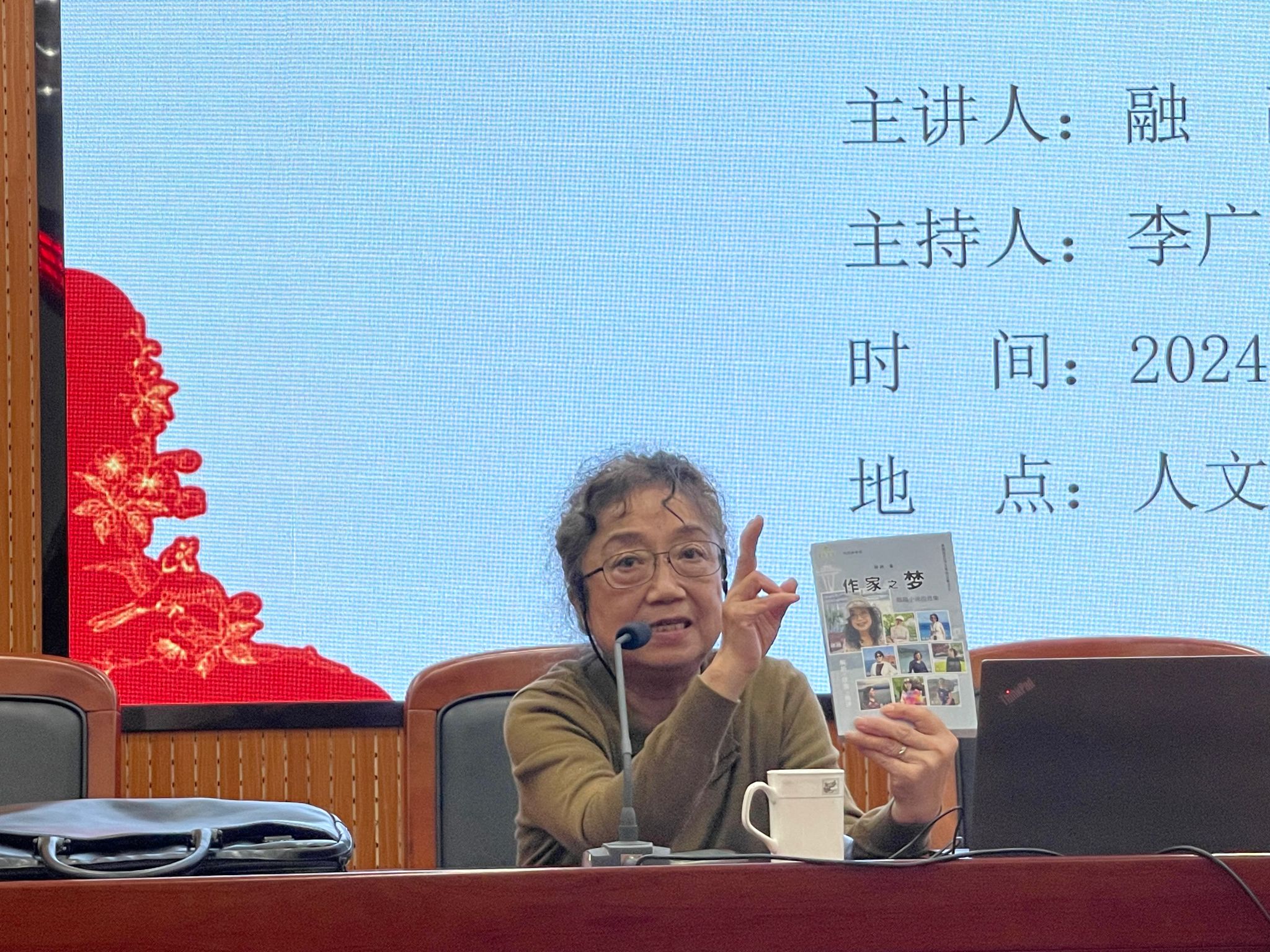 2024年4月11日晚,著名海外华文作家、美国西北华文笔会创会会长融融莅临永利yl23411官网,在203学术报告中心为师生开展题为《高纬度的文学写作——海外华文作家融融小说创作谈》的讲座。活动由永利yl23411官网主办,永利yl23411官网入口创意写作研究中心协办,系永利yl23411官网创意写作系列讲座之一。