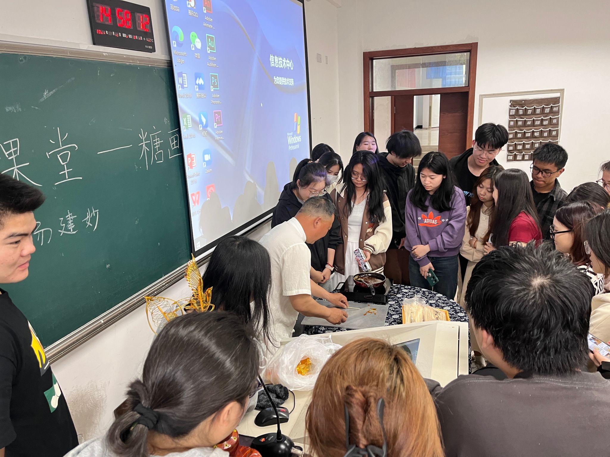 汤建妙老师站在讲台前,手持长勺,演绎着古老而迷人的糖画技艺。他熟练地操控着糖勺,轻轻舀起一勺晶莹剔透的糖液。通过精准的倒、提、顿、放、收等一系列动作,糖液在汤老师的巧手之下逐渐凝固成形。待糖液稍微冷却后,他迅速粘上竹签,再用铲刀轻轻铲起,一只栩栩如生、活灵活现的动物糖画便神奇地呈现在眼前。