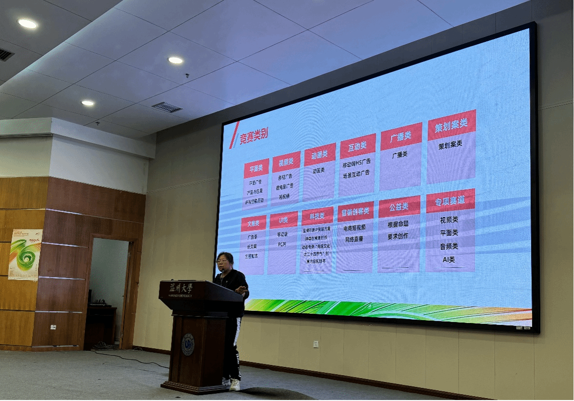 随后由颜志香老师从大广赛的竞赛类别、参赛须知以及作品创作中的注意事项等方面为同学们进行了全面的赛事介绍与指导。