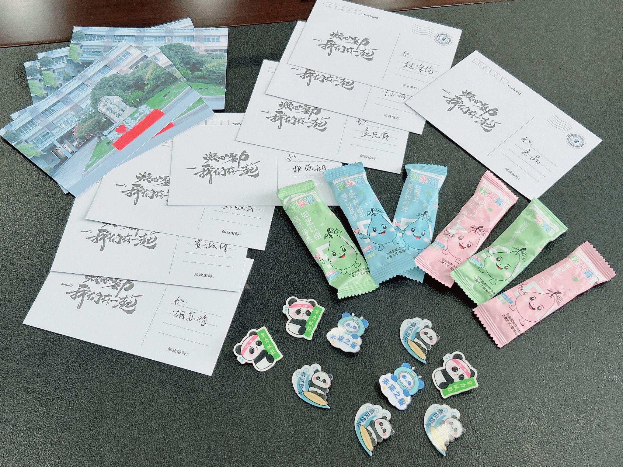 明信片正面,温二实“仰望星空,脚踏实地”的校训以石像之姿巍然展现,激励我们既要怀抱远大理想,又要扎实前行;反面则温柔镌刻着“凝心聚力,我们在一起”的温暖标语,下方每位实习生的名字都是陈董事长亲手所写,她写下我们的名字仿佛就带领我们踏上实习的旅程。徽章设计匠心独运,憨态可掬的熊猫形象为核心,暖意融融的寄语里,满溢着陈董事长对我们实习生们的深切期许,对我们未来教育旅程的美好祝愿。一颗颗梨膏棒棒糖,不仅可爱诱人,更蕴含着健康与甜蜜的寓意。
