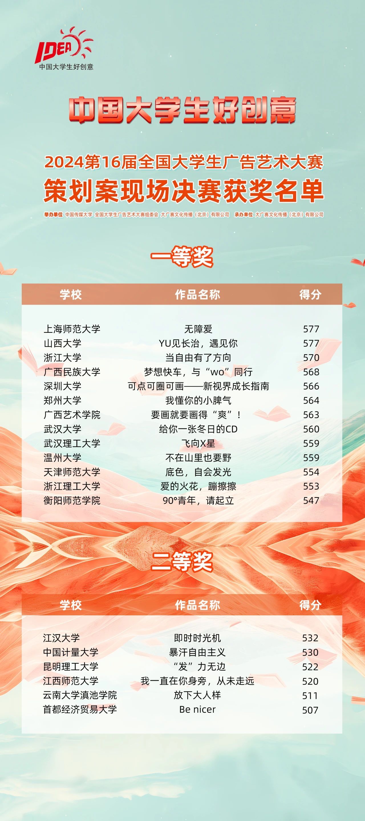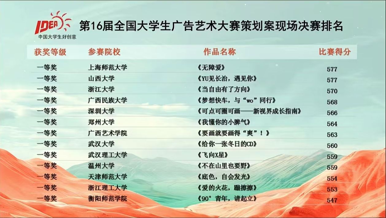 此外,温大广告学子在第16届全国老员工广告艺术大赛中还有一部策划案作品《做个“皮”孩子》(成员:刘怡婷、罗文奇、雷婉欣、李艺欣、刘洋)获得二等奖;两部作品《黑旋风爆改浪里白条》(成员:蔡夏蝶、陈熙妍、邱锰丹、毛家骏、魏开源)和《山》(成员:刘葛俊、马步千、曹凯、王皓天、潘炯尉)获得视频类三等奖;以及策划案《赤尾入境、让爱入境》(成员:程郁紫、吴恙玄铎、顾时雨、成莹、雷婉欣)、策划案《灵感有求,星火必应》(成员:东瑷昕、罗冰晶、卢琬璐、卢传娥、姚凯航)、广播《测谎仪》(成员:周婧、张诗琦、庞颖悦)、IP和创意周边《联通沃派、梦想第一站》(成员:吴奕祺、陆宇婧)四件作品获得优秀奖。