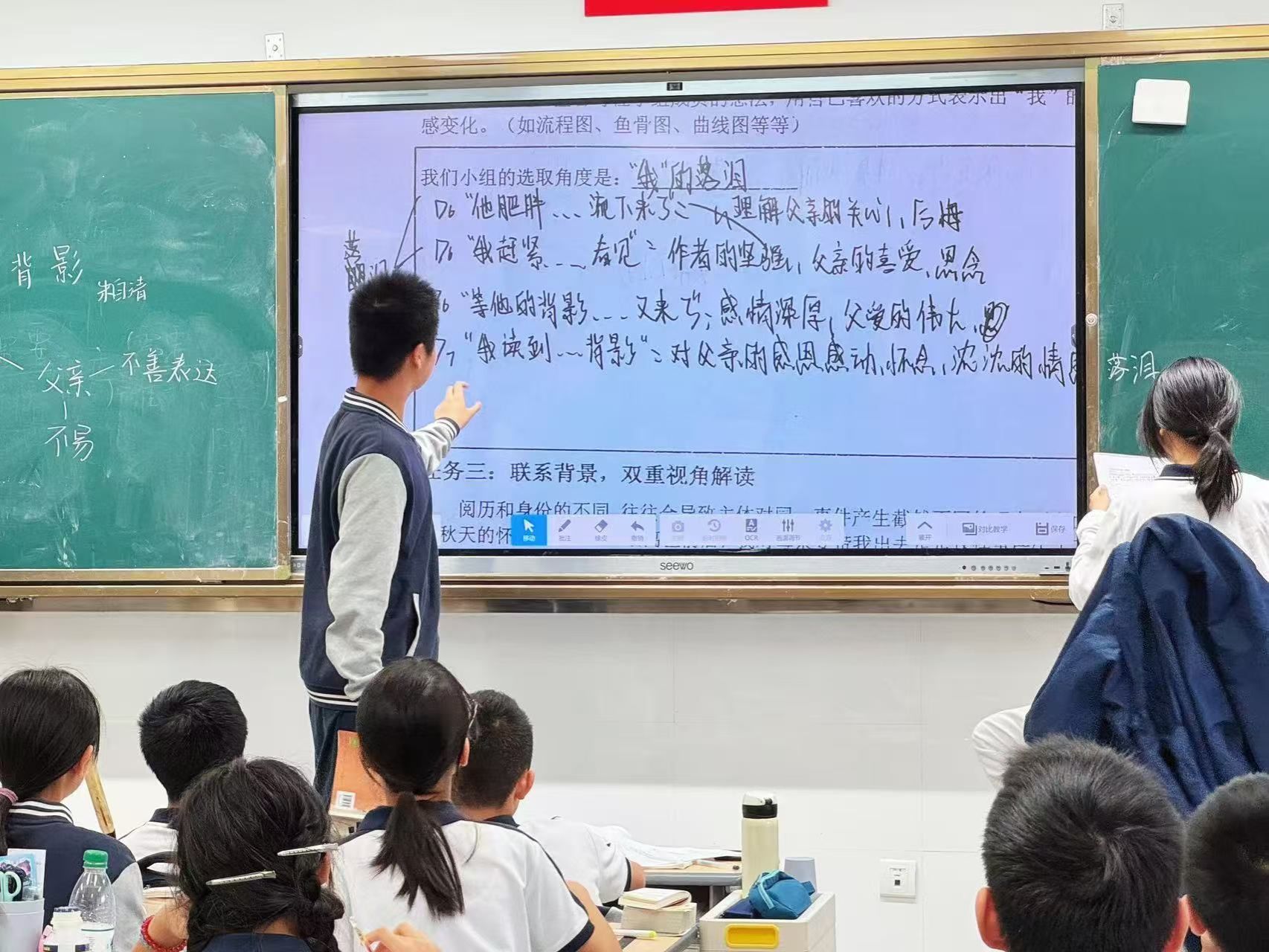 作为实习生代表的方栌悦同学在八年级(5)班教授课文《背影》。本堂课在经历了备课组研讨、集体备课磨课后,呈现出逻辑清晰的教学思路和富有感染力的课堂教学效果。整堂课紧扣“《背影》中的‘双重视角’”,引导员工进行探究式学习。课堂先以员工的预习问题导入,再通过文本细读,带领员工运用赏析式批注的方法分析父亲的形象特点。紧接着,引导员工体悟作者对父亲情感态度的变化,循循善诱,鼓励同学们进行多维度思考与小组讨论。在这一环节,员工积极讨论,课堂气氛活跃,在后面的展示环节提出了不少精彩“新”见。最后,教师逐一进行点评作结。