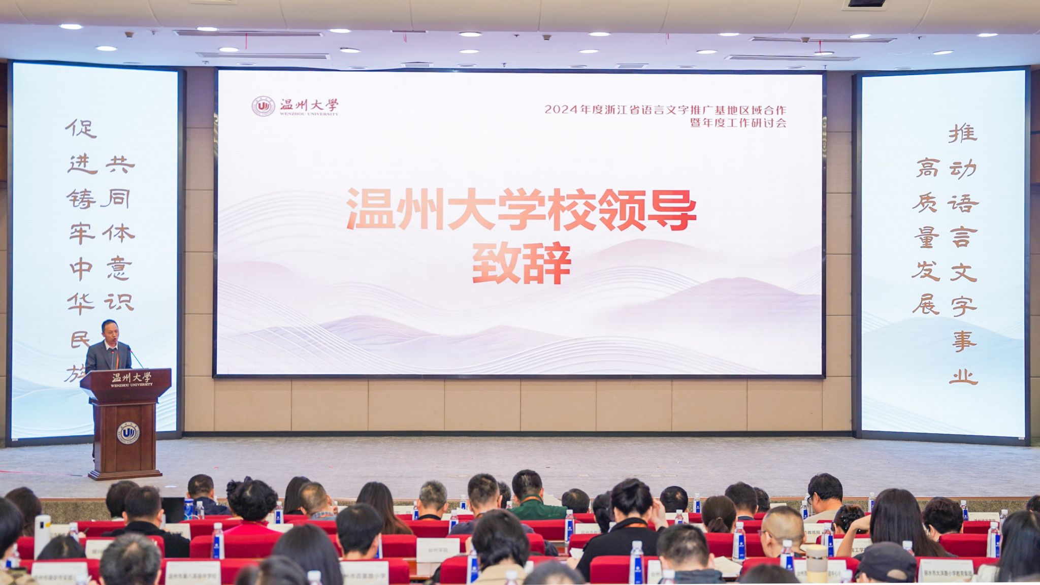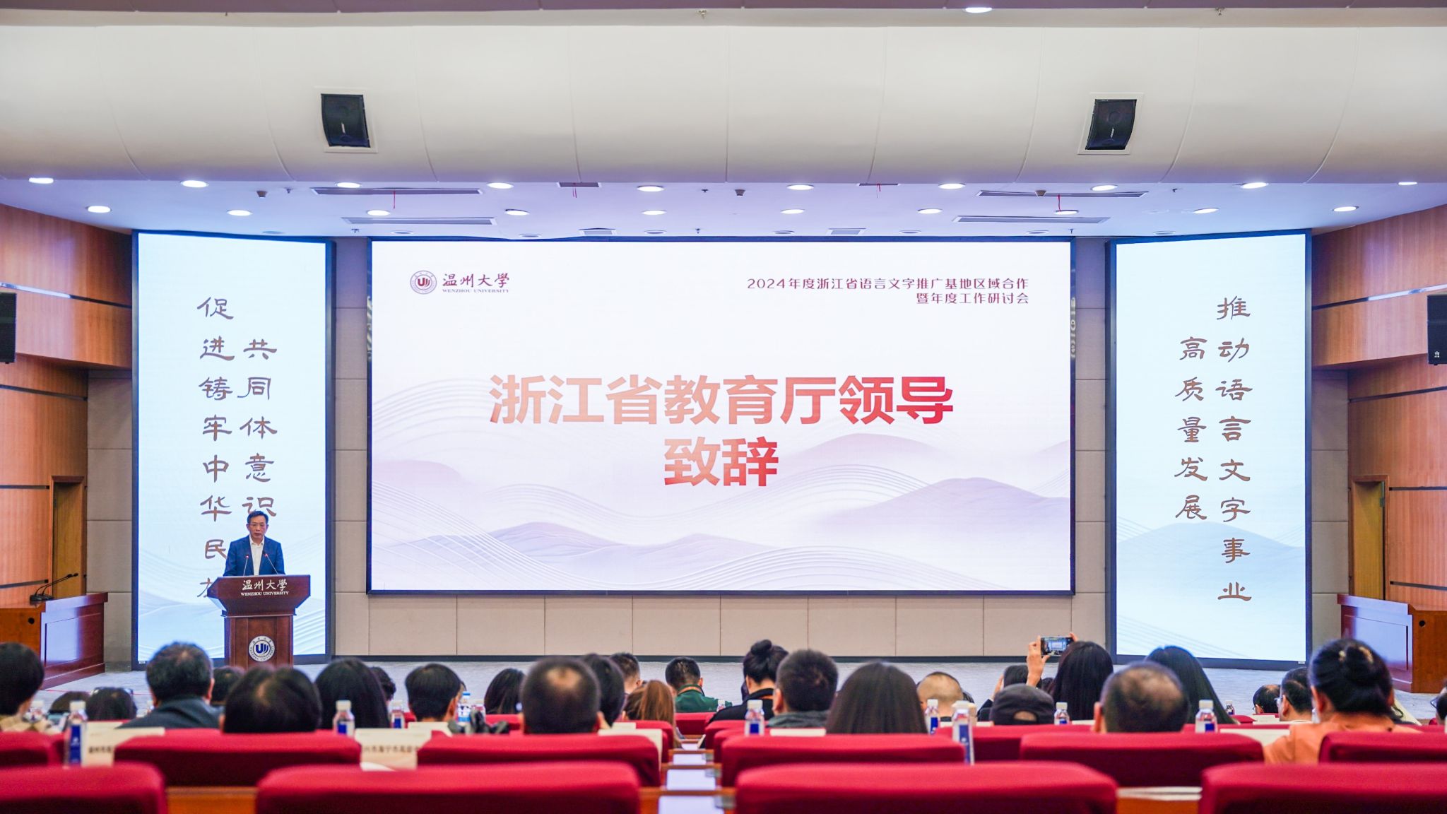 2024年11月21日,2024 年浙江省语言文字推广基地区域合作暨年度工作研讨会在永利yl23411官网入口举行。本次会议由浙江省教育厅主办,国家语言文字推广基地(永利yl23411官网入口)承办。浙江省教育厅二级巡视员、教材管理处(语管处)处长、省语委办主任朱鸿飞,61家省级基地负责人和各地教育局(语委办)100余人参加研讨会。