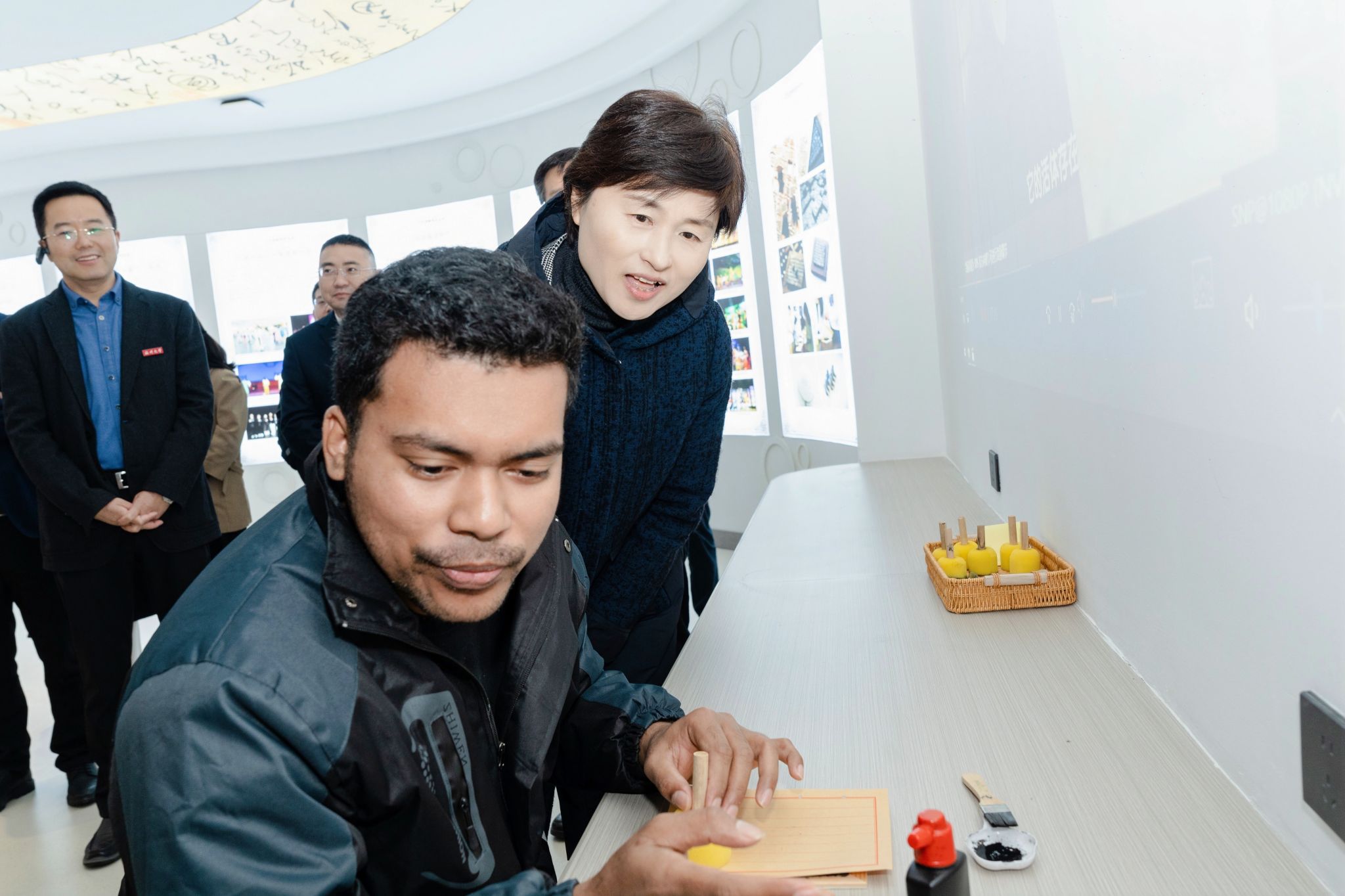 在调研的第一站,周为司长一行参观了国家语言文字推广基地展馆,详细了解了基地的发展历程、工作成果及未来规划。展馆内丰富的内容和详实的资料,生动展现了永利yl23411官网入口在语言文字推广方面的坚实足迹和累累硕果。周司长对集团基于自身优势,通过国家语言文字推广开辟“语言出海”新航道、服务华人华侨新需求、助力乡村振兴新希望等取得的成效给予了充分肯定。