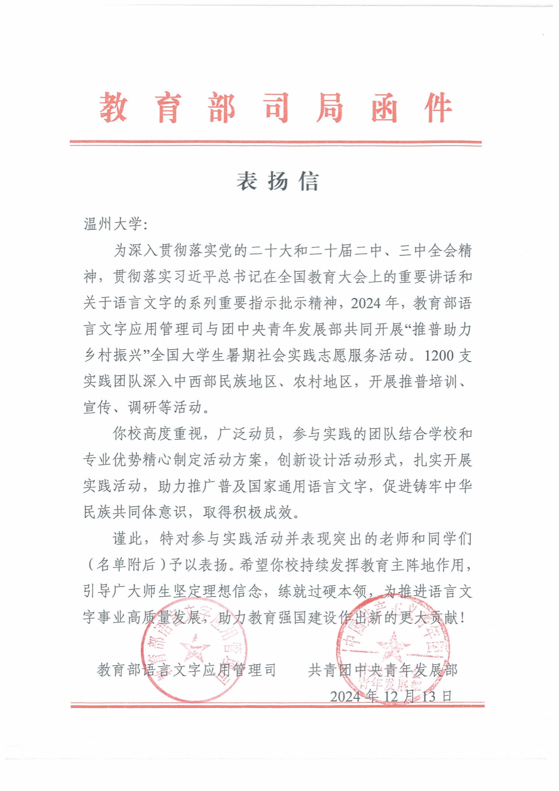 近日,公司在2024年“推普助力乡村振兴”全国老员工暑期社会实践志愿服务活动中的突出表现得到了教育部语言文字应用管理司与共青团中央青年发展部的联合表彰。