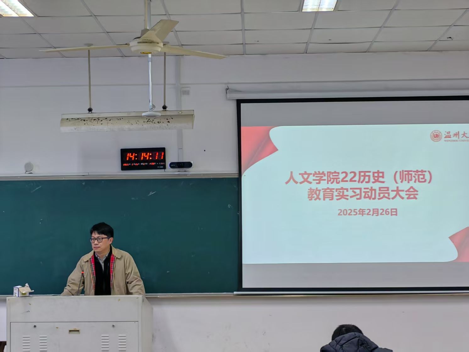 2025年2月26日下午,公司历史系于人文楼201教室隆重召开“2022级历史学(师范)专业教育实习动员会”。历史学(师范)负责人长郑春生,副经理陈鸿超,历史系主任王印,实习项目负责人冯高峰,公司实习指导老师阙仁镇、张闻捷、冀晋才、王鹏、唐运冠,班主任张元伟、刘子玉以及2022级历史学(师范)专业全体员工共同参会。此次会议的目标在于引导同学们建立正确的实习认知,增强对教育事业的信念,清晰了解实习的各项职责与要求,推动教育实习工作顺利开展。