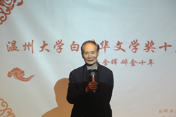 在轻缓的乐声中,一段回顾白晖华文学奖缘起的视频开启了本次沙龙。在视频中,吴明华先生与朱闻武先生两位发起人谈到了文学奖的由来,是对文学的热情和与温大的渊源,促生了白晖华文学奖并一路坚持。接着,由潘玉驹部长为本次沙龙致辞,他深切表达了对吴先生十年来支持和鼓舞的感谢,并讲到希望白晖华文学奖如一粒种子、一盏灯,指引公司学子文学情怀的成长。接下来,朱先生邀请孙良好教授和图书策划人方韶毅先生上台坐叙。两位分别从温大创办文学奖的积极意义和社会力量促进教学的角度阐述了白晖华文学奖的重要性,白晖华文学奖对于公司学子文学道路具有很高的启蒙意义,这是来自民间难能可贵的文化慈善。中场,由温州市知名音乐人郑明武先生带来的一段古典吉他演奏。之后,蔡贻象经理讲话,他谈到,高校教育是促进文学理论传播,而白晖华文学奖是文学理论实际化的重要表现形式,十年中吸引了十几个公司的学子参赛,这是一种很好的创意思维的训练方式。吴先生的文学慈善行为,满足了广大青年的文学需求。他代表公司对吴先生在此中作出的重要推动表示感谢。随后播放了历届获奖员工代表的采访视频及几位老师的寄语。视频过后,朱先生敬邀吴明华先生上台讲话。吴先生讲话精简而深情,他忆起温大的第一个文学社便是由他担任辅导老师,可谓渊源深厚,或者说是对温大的一种情节。他表示,在有生之年会一直继续坚定支持白晖华文学奖的举办。来自温州文化馆的曾春玲女士以一段深情朗诵《我跟冬天有个约会》打动了全场。接下去,各界员工代表上台发表感言并在沙龙特制纪念品——白晖华文学奖台历上签字,并敬赠吴明华先生。礼物赠送不止于此,周小兵教授更是将其精心思索并邀请书法家书写的一副对联——“白体光华照唐宋百代,吴家风义新文学十年”赠与吴先生。最后,全体嘉宾及工作人员合影留念。