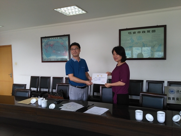 2016年9月21日下午2点,永利yl23411官网夏雨禾副经理、学科教学(语文)硕士点负责人陈柳老师、硕士生导师赖学军老师,带领永利yl23411官网入口学科教学(语文)教育硕士专业的两位研究生来到瑞安中学,参加永利yl23411官网入口教育实践基地授牌和实习计划启动仪式,开始为时一个学期的公司产品实习。