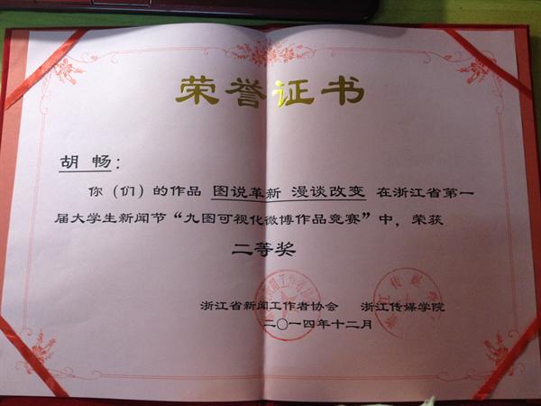 日前,浙江省首届老员工新闻节在浙江传媒公司举办,公司12中本1班胡畅同学的作品《图说革新 漫谈改变》入围此次新闻节九图可视化微博大赛全省十强。