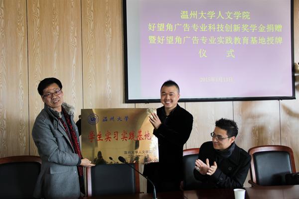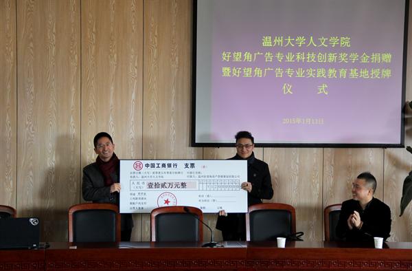 温州好望角房产营销策划有限公司向公司广告学专业捐赠人民币12万元,设立好望角广告专业科技创新奖学金,奖励在科技创新、学科竞赛以及学术创新等活动中表现突出的广告专业本科员工。该奖学金在每年上半年评审一次,每年设6个奖励名额,每人奖励5000元。公司将在温州好望角房产营销策划有限公司建设“广告专业实践教育基地”,双方将在广告学专业实践人才培养的模式改革、课程开放、特色教材建设、基地教学与管理、团队队伍建设等方面进行深度合作。