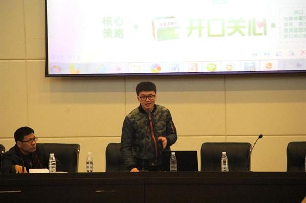 随后展示的是来自浙江大学城市公司的作品——999感冒灵品牌营销策划案《开口关心》,由何林青同学代表队员展示。他们将999品牌竞争力概括为温暖和关怀的形象,将产品的开口与人的开口结合,鼓励消费者从尝试到习惯开口关心他人,强调独立第一步从分享爱开始,整个策划案充满了人文关怀。同时,活用视频和广告歌,也与煽情的基调相得益彰。