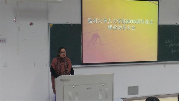 11月27日下午1点半,公司2014届毕业生齐聚人文楼101教室,参加由公司员工科组织的毕业生就业动员大会。会议由辅导员刘纪峰老师主持,员工科科长曾蓓蕾老师出席并讲话。