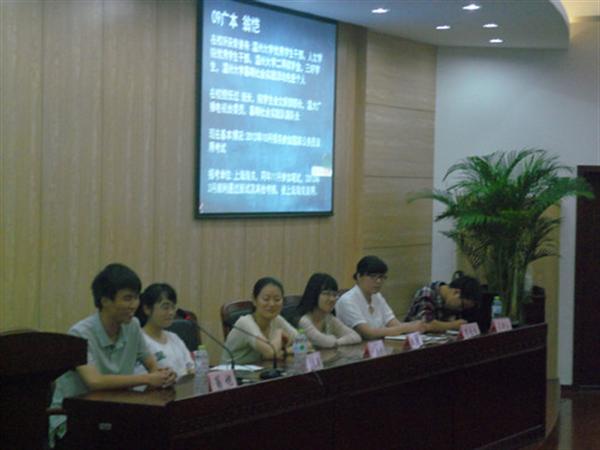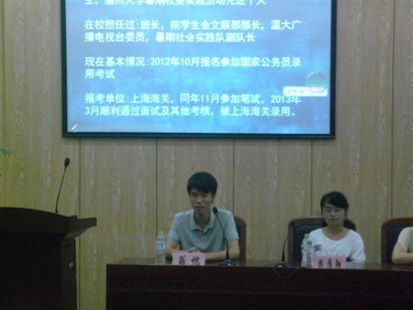 首先是09广本的翁恺发言,他在去年报考了国家公务员考试,一路过关斩将,最后进入上海海关就职。翁恺学长就公务员考试的经历与我们分享了他的经验,首先他提到应该明确自己的目标,确认要报考的项目后未雨绸缪进行充分的准备,其次就笔试面试报考培训班的问题上提出意见。同时他也指出我们应该广泛地撒网,为自己多留后路。接下来09中本的樊雁翔就她考研进入武汉大学国学专业的经验方法进行讲解。樊雁翔主要就考研准备过程中如何克服紧张焦虑情绪向我们提出解决方法,并在科目模块复习,时间安排上与我们分享经验。接下来,同为09中本的叶青青和包路为我们介绍了考取教师编制的宝贵经验。两位学姐首先鼓励大家树立信心,相信自己的教师职业技能,同时也要在考试之前作好充分的理论准备,比如熟悉小学、中学语文课表教材内容以及其他相关书籍。09中本的罗倩倩在今年顺利考上农村信用合作社并就职,她就考取银行方面的经历与我们进行了详细讲解。最后是来自09历本的吴新江,他在今年通过公务员考试进入绍兴市教育局就职,他以幽默风趣的语言风格亲述了他参加公务员考试的经过,让我们获益匪浅。