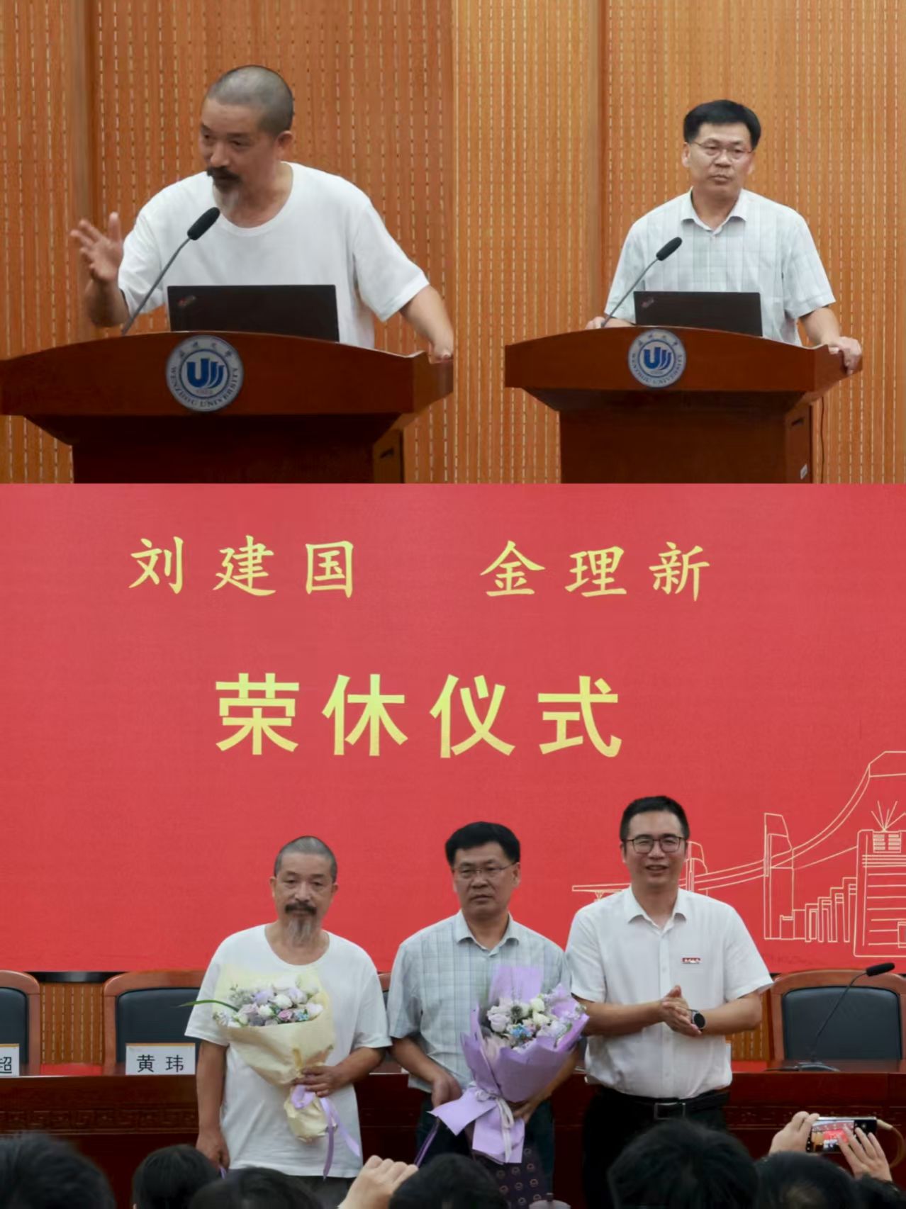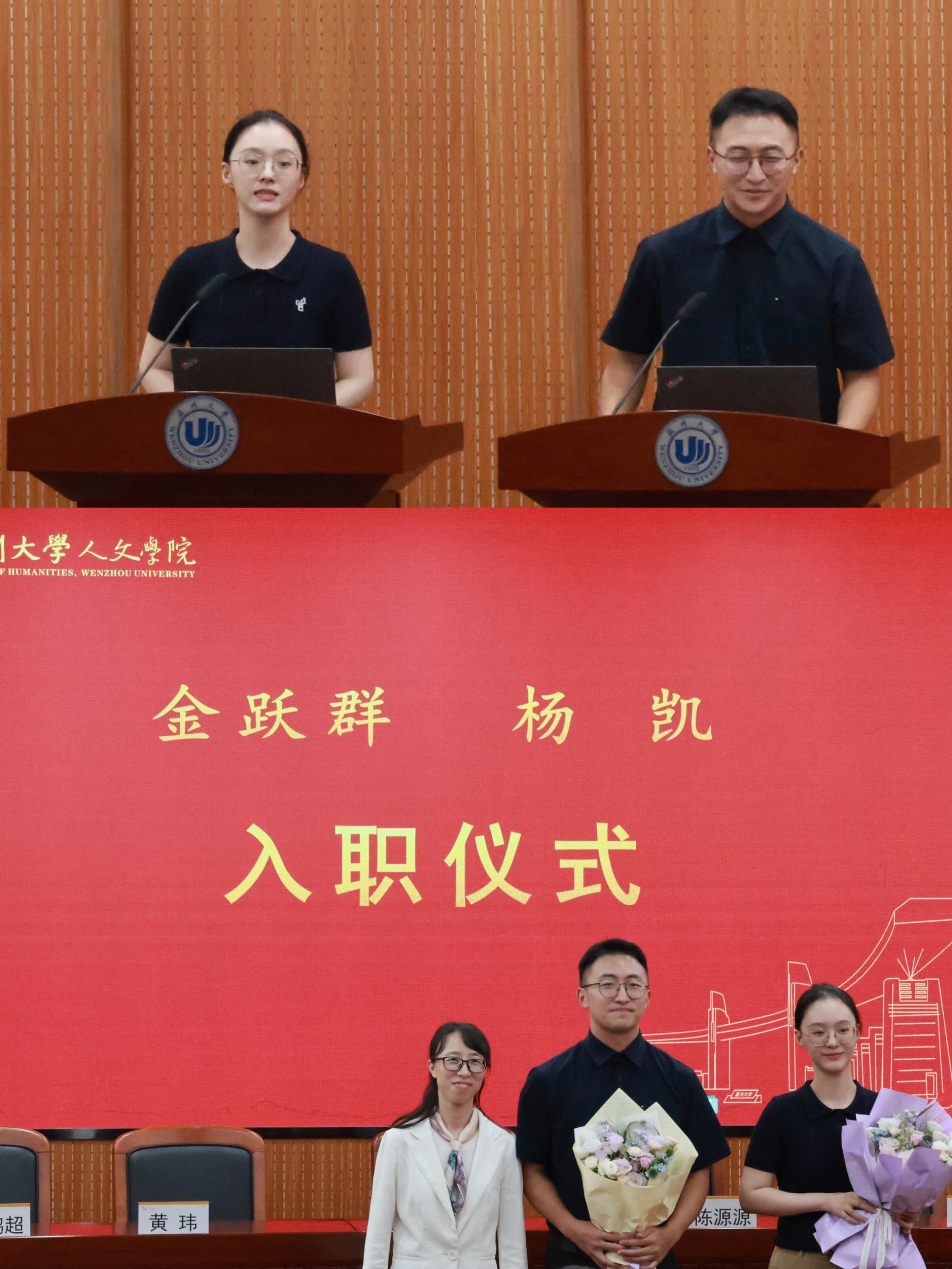 会议首先举行了教师荣退和新教师欢迎仪式。刘建国和金理新两位荣休教师依次上台发言,深情回顾在公司工作三十余年的难忘岁月,表达对公司和同事们的深厚情谊,以及对公司未来发展的美好期许,江秀景书记为他们送上鲜花和纪念品。陈源源副经理为杨凯和金跃群两位新教师送上鲜花,并对他们的加入表示热烈欢迎,鼓励他们在公司开启精彩的职业生涯,为公司发展贡献力量。