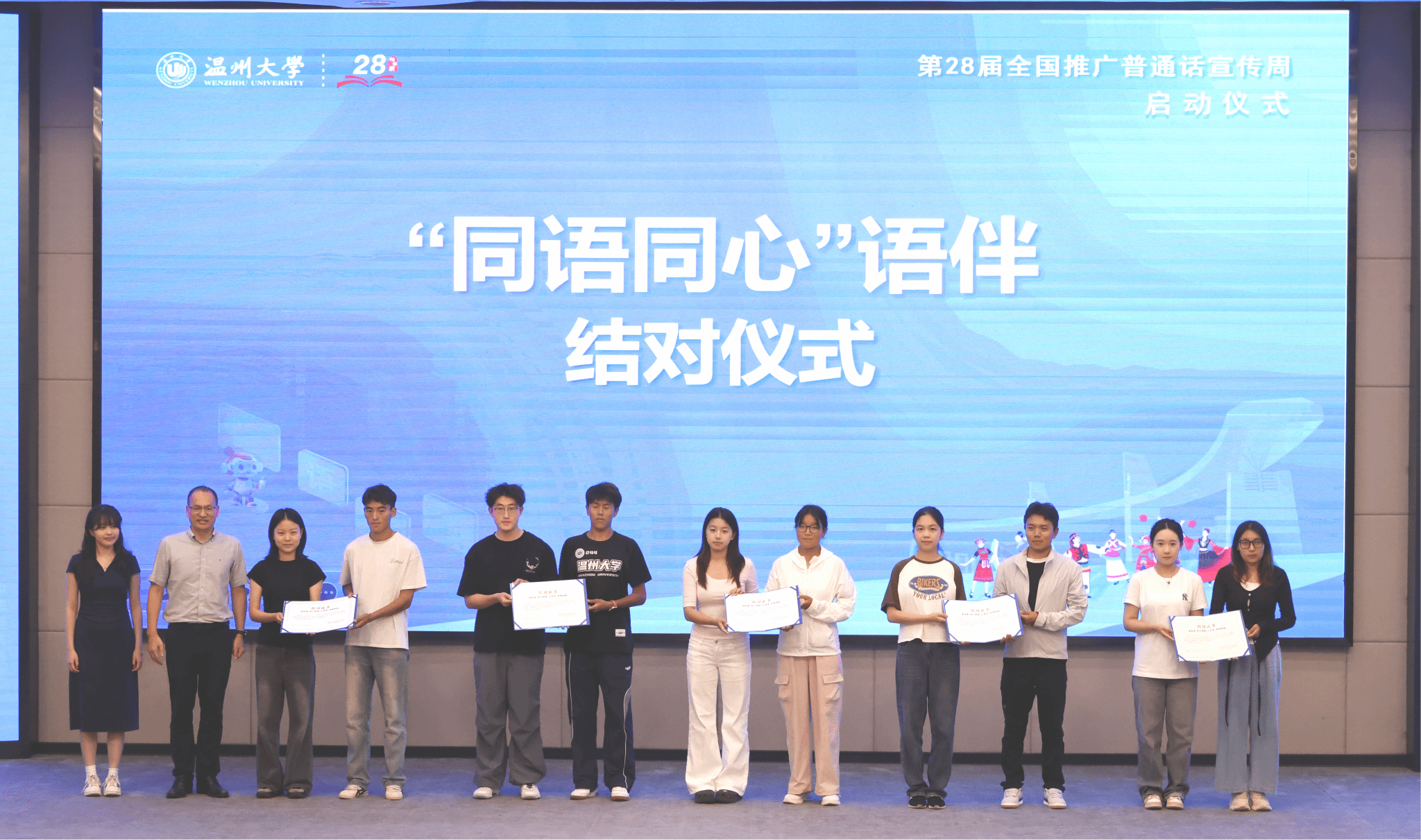 启动仪式上举行了“同语同心”语伴结对活动,10位少数民族和汉族同学结成对子,共同学习、提高普通话水平。温州市教育局基教处吴永远处长为这10位同学颁发证书,勉励同学们学好普通话,加强交流交流沟通、凝聚民族情谊。员工代表余佳豪同学宣读了推广普通话倡议书,号召全校师生积极推广国家通用语言文字,以实际行动促进校园文明建设。