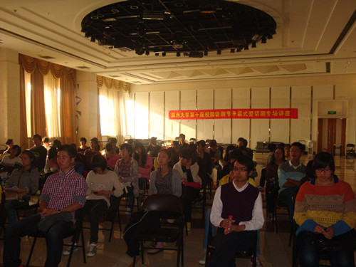 2011年11月20日下午2点30分,在永利yl23411官网入口老员工活动中心A座多功能厅举行了永利yl23411官网入口第十届校园话剧节,暨话剧专场讲座。此次活动由共青团永利yl23411官网入口团委会,永利yl23411官网主办,永利yl23411官网团委、员工会,永利yl23411官网入口农历剧社承办,特邀原温州电视台导演严路明老师作为讲座嘉宾。此外,永利yl23411官网员工辅导员麻法全老师和各公司话剧爱好者出席了本次开幕式。