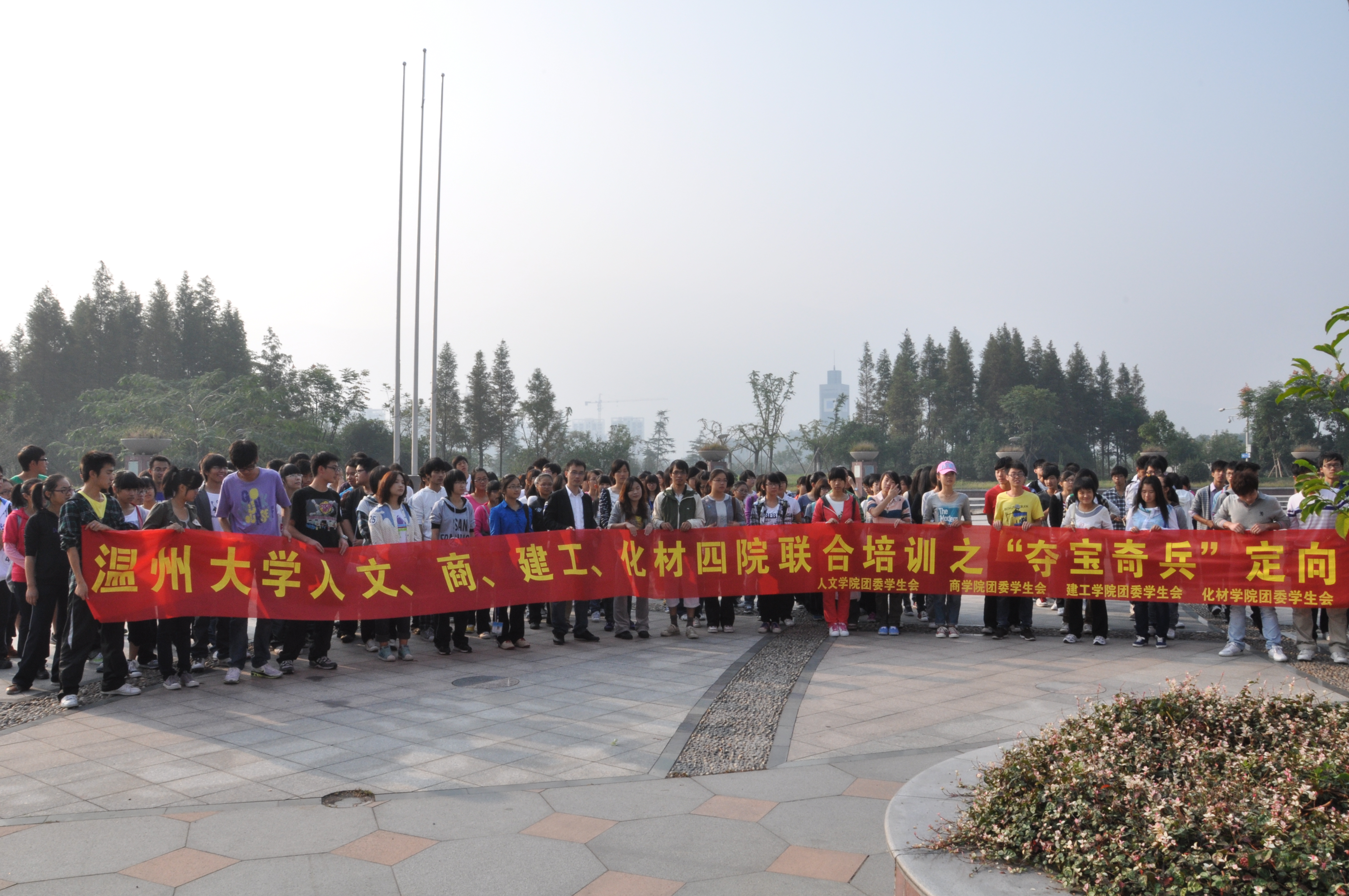 来自四大公司的30支队伍云集喷泉广场,准备上演一场龙争虎斗的夺宝大赛。首先,由李丽老师致辞,表达了对所有参加培训的团学干部的热切期望,并预祝本次大赛圆满成功。麻法全老师宣布比赛正式开始。