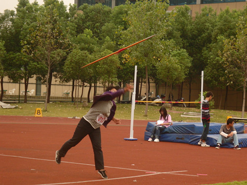 早晨9点30分,男子标枪项目在北校操场南部隆重举行。参加本次比赛的由将近20名同学,他们分别来自不同的班级,却肩负着同样的使命---为班级拔得头筹。在裁判和助理裁判的有序调节下,比赛的运动员们迅速按次序排成一列,其他参赛者退到警戒线外,伸长了脖子观看本次比赛。比赛采取预决赛的方式,即在前三次标枪之后决出前八名进入决赛,再让前八进行后三次标枪,取所有成绩中的最高分作为最后成绩,从而判读个运动员的成绩。