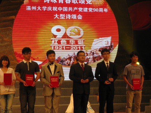 开幕式后举行“诗咏青春歌颂党”建党九十周年大型诗歌朗诵会,全校来自二级公司及部门选送十个朗诵节目恢弘演绎咏志情怀。永利yl23411官网选送的群颂《我的祖国》以飒爽的英姿亮相舞台,在场师生掌声不断,来自公司的80名员工代表高呼“文韬武略,扬我人文”,充分展示了人文学子的良好精神风貌。最后公司党委书记陈福生、副书记林娟娟与公司党总支副书记骆锤炼老师等全校师生代表共同演绎原创诗朗诵《党建纪元逾九十 歌颂党史唱温大》,令全场激情澎湃、荡气回肠,晚会达到高潮。大会在全场起立齐唱校歌的庄严氛围中,将爱党荣校的精神“润物细无声”深植入了全体温大人的心中。在上周三上演的庆祝建党九十周年诗歌朗诵大赛中,《我的祖国》获得群诵组第二名的好成绩,同时也荣获了“优秀创作奖”奖项。