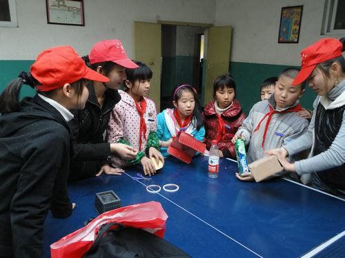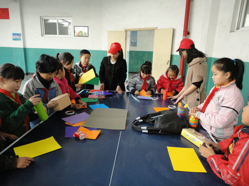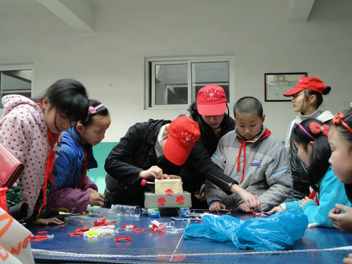 下午1点40分,志愿者们抵达益民公司。本次活动以小组为单位,每组约有七八个成员,分4组开展。特别指出的是,本次活动不是以课堂的形式开展,而是在公司体育活动室的乒乓球台上进行。从而给予了小朋友更多的活动与交流空间。活动材料包括各种回收的物品:有可乐罐、雨伞、衣服、硬纸板、皮包等等。志愿者们和小朋友一起发挥创意,裁剪、拼贴、画图,做出了各种类型的新鲜玩意儿。其中有个小朋友将一件衣服制成了颇具苏格兰风味的女士帽,吸引了好些小男孩。还有个组利用硬纸板,双面胶,小篮子,可乐瓶的头部组装成了一辆小坦克……志愿者们将新鲜有趣的实践活动带到课堂,通过交流指导合作提高了小朋友们的实践操作能力,活动进行顺利,教学效果良好。