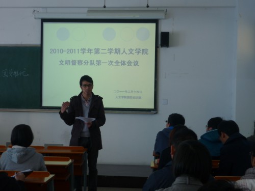 3月16日下午1:30,2010-2011学年第二学期永利yl23411官网文明督察分队第一次全体会议在1-105教室准时举行。此次会议由永利yl23411官网团委组织部负责,辅导员麻法全老师出席,文明督察队的各成员参加。